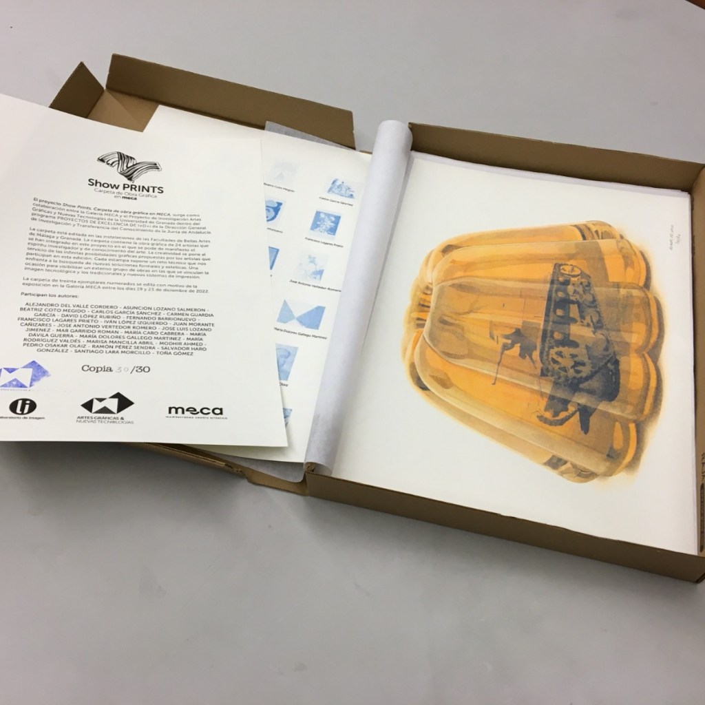 El proyecto Show Prints, Carpeta de obra gráfica en MECA, surge como colaboración entre la Galería MECA y el Proyecto de Investigación Artes Gráficas y Nuevas Tecnologías de la Universidad de Granada dentro del programa PROYECTOS DE EXCELENCIA DE I+D+i de la Dirección General de Investigación y Transferencia del Conocimiento de la Junta de Andalucía.