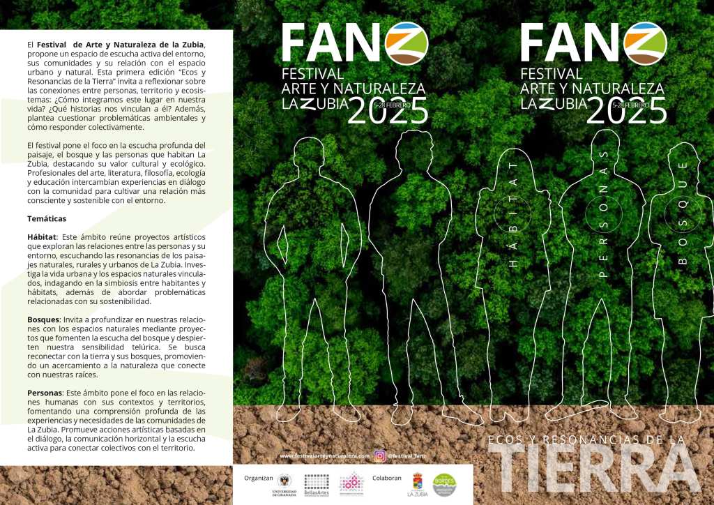 En su primera edición, el Festival de Arte y Naturaleza de La Zubia: “Ecos y Resonancias de la Tierra», plantea tres grandes ámbitos de trabajo que abordan cuestiones transversales entre el arte, la ecología, la poesía, la filosofía y otras disciplinas de las humanidades: