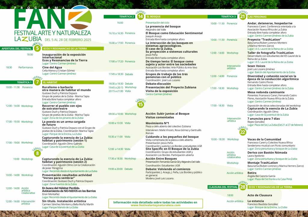 El proyecto se desarrolla con la puesta en marcha de la primera edición del Festival de Arte y Naturaleza de La Zubia, a los pies del Parque Natural de Sierra Nevada. En febrero 2025, durante un mes de programación intensiva, el Festival ofrece un programa con actividades artísticas, talleres, charlas y conferencias centradas en la intersección entre arte, naturaleza y territorio, promoviendo la creatividad, la sostenibilidad y el cuidado del entorno. El concepto de territorio se aborda desde una perspectiva que invita a investigar y fomentar las relaciones de las personas con el territorio que habitan, con el objetivo de fortalecer la consciencia sostenible y el sentido de pertenencia. Todo esto se quiere desarrollar con y desde el arte, integrando procesos creativos que conecten a la comunidad con su entorno natural y cultural.