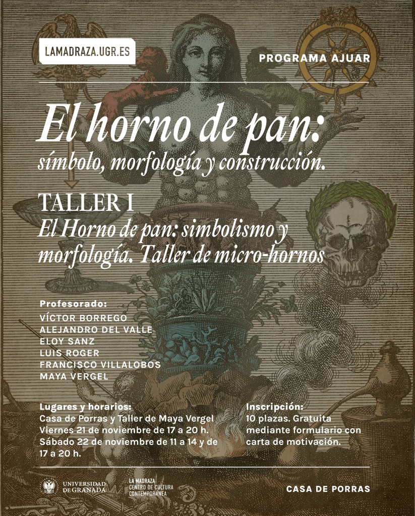 Ciclo El Horno de pan: simbolismo y morfología. Taller de micro-hornos. Organiza: Área de Artes Visuales y Diseño, Casa de Porras. Programa Ajuar. Colabora: Colabora: Proyecto de Investigación ‘Las buenas artes de vivir con las otras a través del diseño (PID2024-158514NB-I00)’, financiado por el Ministerio de Ciencia, Innovación y Universidades, la agencia Estatal de Investigación (DOI 10.13039/501100011033) y por el Fondo Europeo de Desarrollo Regional de la Unión Europea.